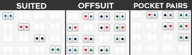 翻前总共可发出1326种底牌组合,从AA到32o。以下是每种底牌类型的可能组合的直观表示方法: