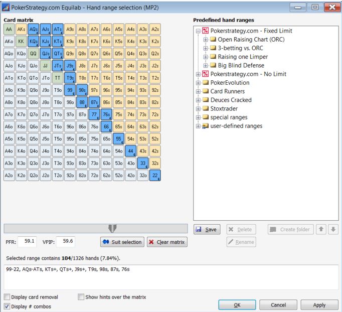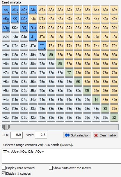 范围中底牌的总组合数将以分数和百分数形式显示在滚动条下。在本例中,这个范围包括74种组合,或者说占全部起手牌的5.58%。