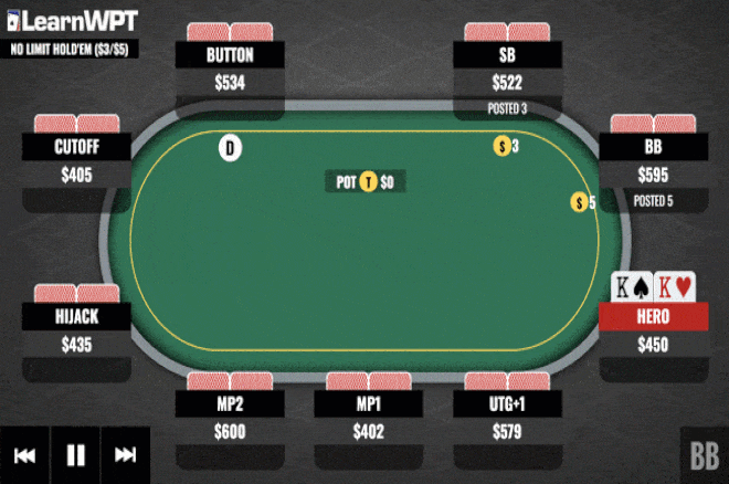 你翻前用口袋KK加注,得到一个跟注,然后他在这种翻牌面领先下注。这种场合论证了一个许多牌手对于扑克的一种误解。人们往往喜欢问自己“我现在是否领先?”,而不是“这手牌最有利可图的玩法是什么?”在这种场合,问自己正确的问题是找到正确答案的关键。