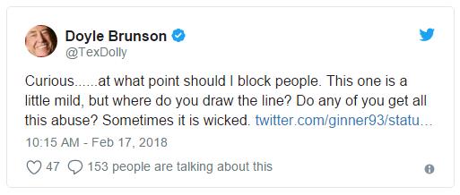 但是,在收到越来越多的恶言回复之后,Doyle Brunson开始了拉黑某些用户,一时间让人误以为他的号被盗了。