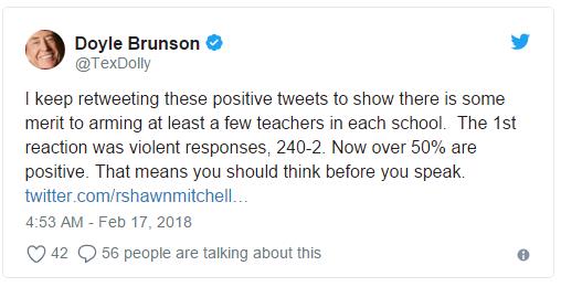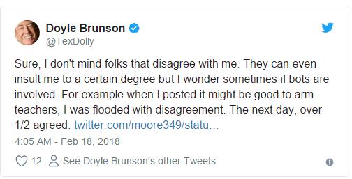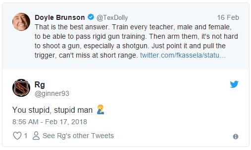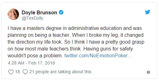 Doyle Brunson最近通过推特表示在每个学校让一部分教师配枪是个不错的主意。正如预期的一样,Doyle Brunson关注者中不同意的人立马跳了出来反驳。