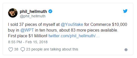 YouStake的CEO兼合伙人Frank DeGeorge表示,Phil Hellmuth还会众筹自己2018 WSOP的买入。