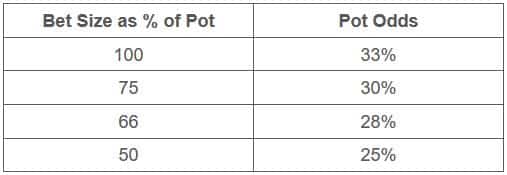 当面对一个河牌下注时,我们可以通过底池赔率的计算来找出我们必须正确跟注的频率。下面是一张常见下注尺度对应的底池赔率表: