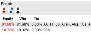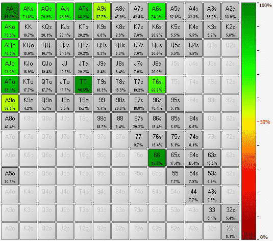 翻牌圈价值下注范围:AA,TT,66,ATs+,A6s,T6s,ATo+