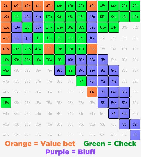 首先,我们需要制定一个进攻计划。在这个例子中,我们选择一个在每条街用我们的价值牌做75%底池下注的简单进攻策略。因此问题就变成了:哪些是我们用来价值下注的手牌?