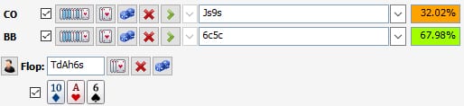我们最弱的没有同花听牌的Tx手牌可以被弃掉了。我们没有同花听牌的卡顺听牌也太弱而无法继续下去 – 唯一强到可以继续下去的听牌是9s8s,9s7s,8s7s。你可以考虑用这些听牌和66组成的暗三条进行过牌-加注。因为这些听牌几乎没有摊牌价值但是却有着很高的听牌强度。在这个例子中我们将用这些牌来跟注下去。