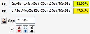 我们看到我们的范围只有47.01%的权益,这意味着我们处于一个范围劣势。因此,我们可以在翻牌圈适当的多弃掉一些手牌而不用按照MDF的要求来做防守。否则,当进行到河牌圈时我们的手牌范围将会过于孱弱,我们将被迫放弃很多的手牌。