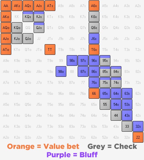 这里我们选择去诈唬159/451手牌=35.25%的范围。当我们下注时,我们价值下注的频率是58/(58+159)=26.7%。你可能会觉得这个数字有点低,但是你要记住我们的诈唬牌有着良好的底池权益同时我们相对我们对手有着范围优势,所以我们翻牌圈诈唬会稍微的有利可图一点。