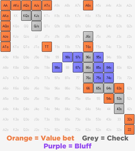 鉴于对手的范围优势(同时也为了简单起见),我们将用我们的整个范围通过跟注来继续。那些例如66或ATo显然可以用来做过牌-加注的强手牌将仍然保留在我们的跟注范围里来防止对手在接下来的几条街激进的做超额下注。