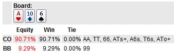 大盲位面对CO河牌持续下注继续下去的范围(66,A9s-A6s,A3s-A2s,T6s,ATo-A8o,A5o-A4o)