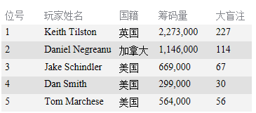 目前的筹码量领先者是Keith Tilston,紧随其后的是Daniel Negreanu,Jake Schindler,Dan Smith和Tom Marchese。Keith Tilston此次是第三次打入美国扑克公开赛的决赛桌,并在第三项赛事中取得比赛亚军。