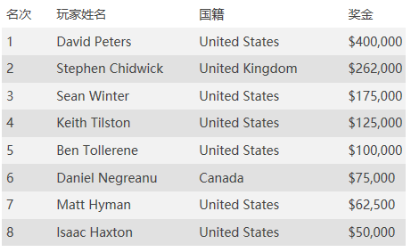 在前三强的比赛中,David Peters所持的筹码量是总筹马量的二分之一,但中途在与Stephen Chidwick对决的一场牌局中,他输掉了不少筹码,两人都击中了两对牌组,但是Stephen Chidwick是顶两对。
