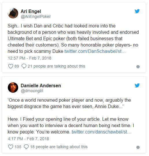 在CNBC主持人Dan Schawbel对扑克和投资的阐述中,他称Annie Duke是“世界知名的牌手”,但如今很多圈内的玩家都表示她不要再拿自己曾经的打牌经历说事了。很多知名牌手也对此明确的发布了推特,看来这个Annie Duke是真的挺不受这个圈子待见的。