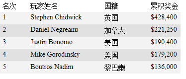 2018美国扑克公开赛玩家累积奖金排行榜前五玩家: