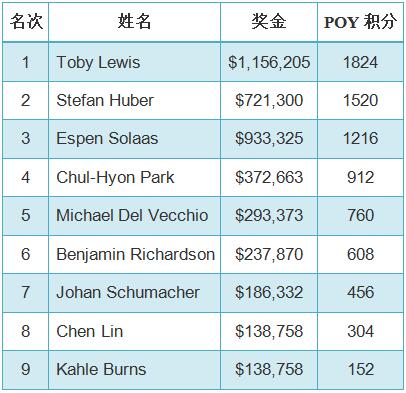 随后Lewis在一手口袋KK 对抗A♦ 9♣的牌局中将Solaas淘汰在第三名。在和Huber的单挑对决中,Lewis握有约2 : 1的筹码优势,仅用16手牌便锁定冠军。