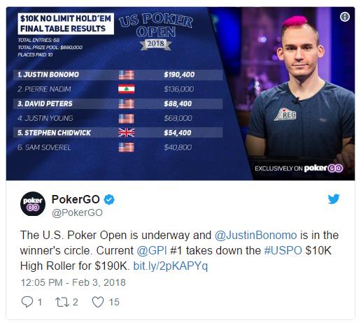 Justin "ZeeJustin" Bonomo在美国扑克公开赛$10,000无限德扑公开赛中一举夺魁,收获奖金$190,400。