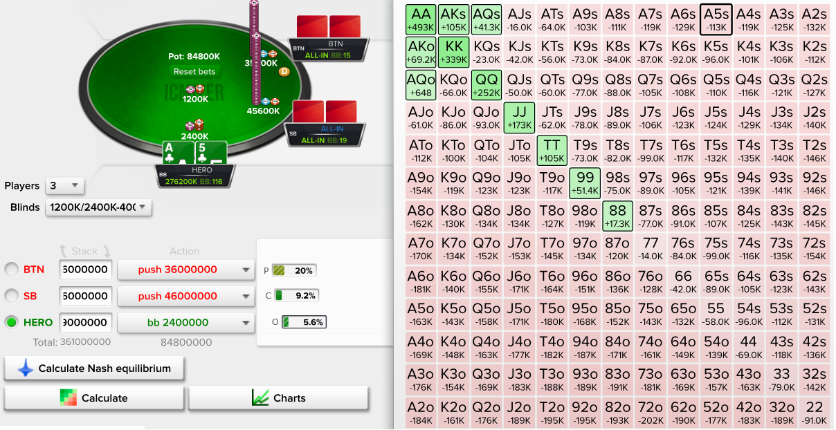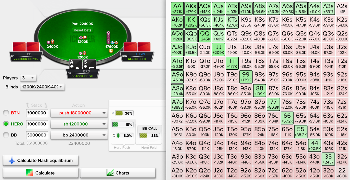 第一手牌,盲注120万/240万,前注40万。Pollack在按钮位置用J♣ 4♣ 全压1790万筹码。我们现在立即使用ICMIZER软件,你可以看到,用这手牌全压将导致8233美元的亏损。下面说明了你范围中的每一手牌会输赢多少。把目光移到J4s这手牌,看看结果。不用理睬被选中的A5s,因为那是因为某种原因默认被选中的牌。