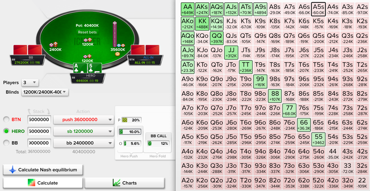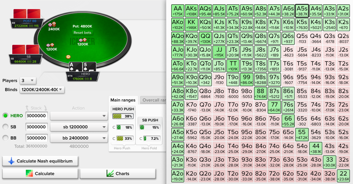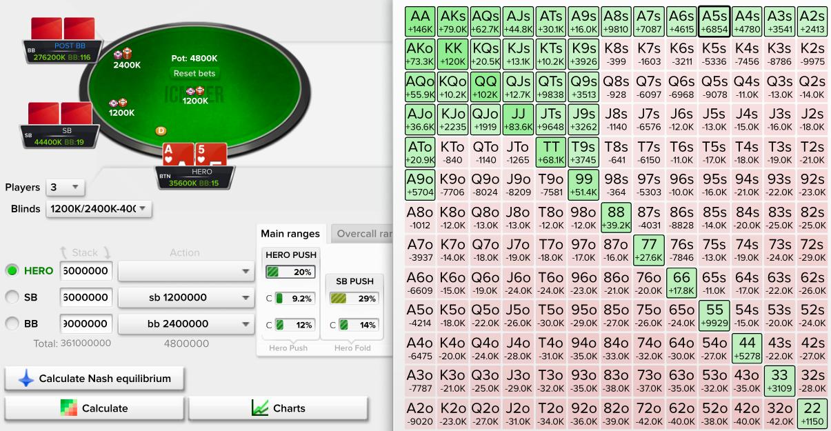 一般而言,当你有大约13BB筹码(或更少)时,如果前面玩家都弃牌,你可以用宽一点的范围全压,但如果跟注全压需要花费大量筹码,你需要有很大优势才能跟注。这往往导致了跟注范围比很多业余牌手想象中紧很多。