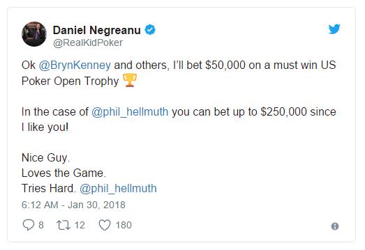 和去年9月首届扑克大师赛一样,大丹牛(Daniel Negreanu)再次和大家打起了赌,底注$50,000,他赌自己会是此次美国扑克公开赛的最大赢家,也就是赛事累积奖金最高的选手。