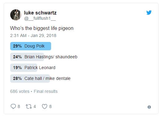 比如下面这则推特——谁是最喜欢忽悠人的骗子?Doug Polk以29%的得票率“排名第一”。