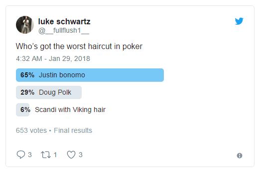 Luke Schwartz在给出问题时似乎根本没打算给谁留面子,比如下面这个问题——牌桌上最丑的发型是谁?Justin Bonomo以65%的得票率“脱颖而出”。这个话题一时间在圈内疯传,特别是在牌手之间。