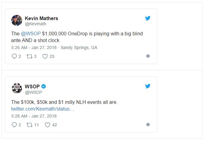 世界扑克锦标赛宣布将在2018 WSOP期间对一些高额买入赛事实行大盲底注兼计时。官方推特在WSOP网络推广经理Kevin Mathers爆出该消息之后进行了解释说明。具体哪些赛事将实施该要求尚未公布。