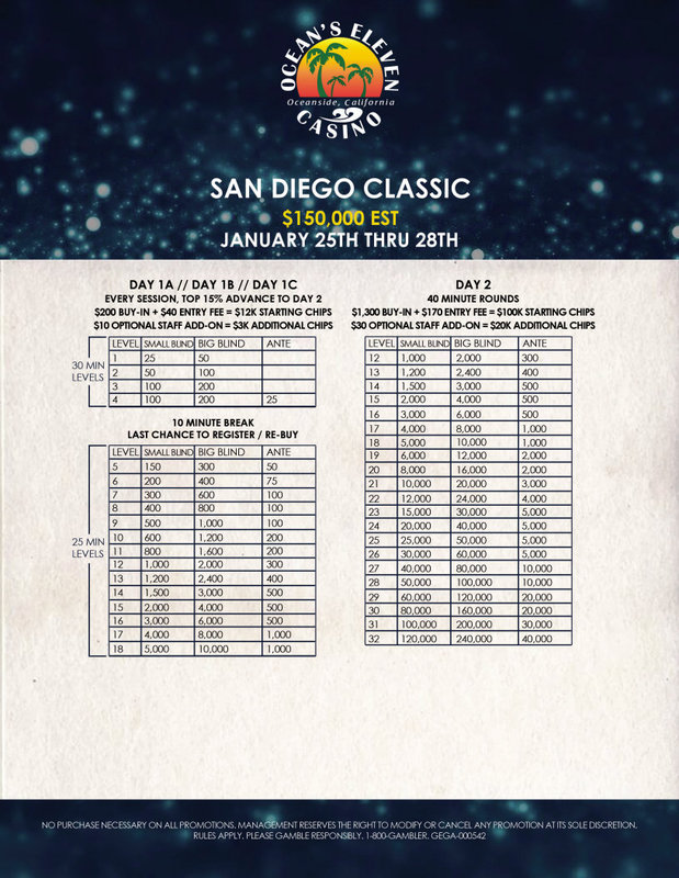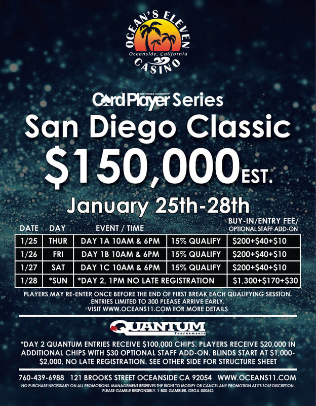 CPPT巡回赛的主赛事,250美元买入圣地亚哥经典赛设在加利福尼亚欧申赛德(Oceanside)。预选赛Day1分为六个场次,比赛日期为1月25日至28日,为期三天。 虽然主赛事的预计奖池大小仍是15万美元,但最近两年主赛事都吸引了超过900名选手报名,总奖池将近25万美元。