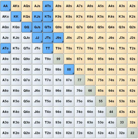 对手的范围在Equilab的底牌矩阵中看起来是这个样子: