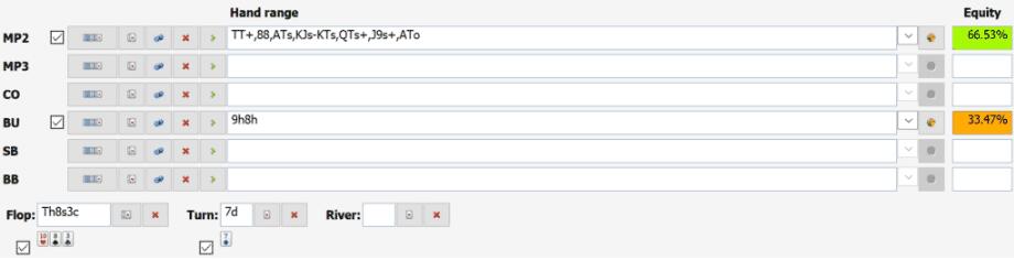 现在我们把那个范围,我们的底牌(9♥ 8♥)和公共牌面(T♥ 8♠ 3♣ 7♦)代入工具中:
