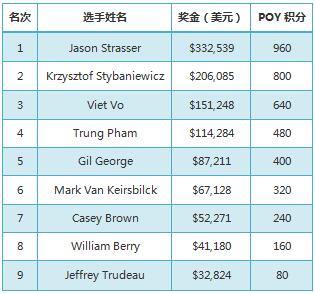 除了拿到金戒指和冠军奖金,Strasser也拿到了960个Card Player年度最佳牌手(POY)积分。以下是比赛的最终结果。