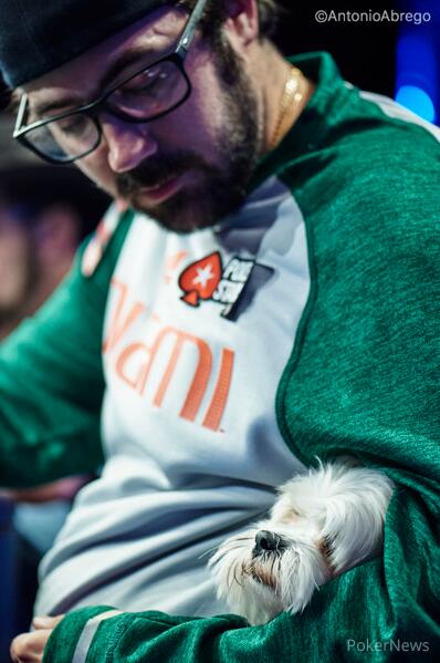 Jason Mercier在2017 WSOP赛场深情凝视宠物狗Marshmallow。