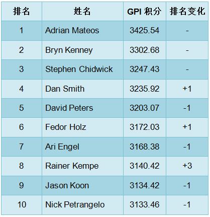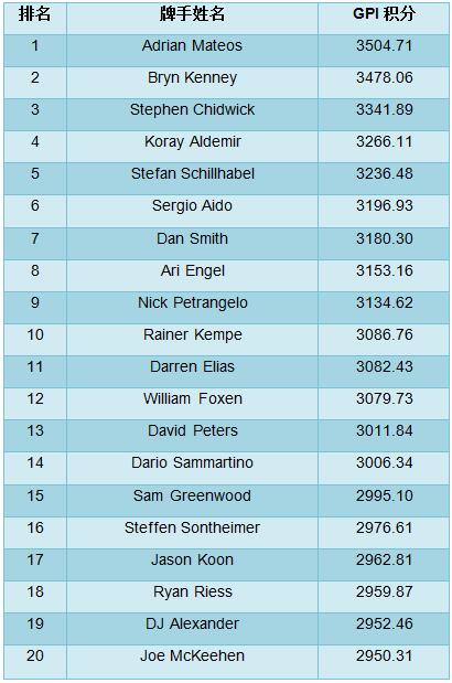 首先我们来看看2017 GPI年度最佳牌手的最终结果。西班牙牌手Adrian mateos以不到30个积分的微弱优势击败美国牌手Bryn Kenney,获得这一头衔。以下是年度最佳牌手榜的最终排名: