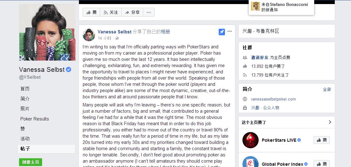 在她脸谱网冗长的声明中,Vanessa Selbst告诉她的关注者自己的职业生涯就是以作为一名职业扑克牌手开始。她承认在长达12年的扑克生涯中扑克给予了她太多,打牌是一种智力挑战,让人愉悦让人开心,同时也让人收获金钱。她同时也承认自己的离开有多重原因。Vanessa Selbst在文中写道“因素有很多,重要的和次要的都有。”