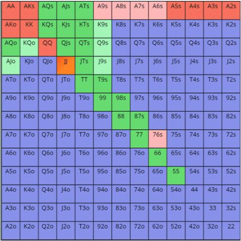 (说明:红色方格代表4bet,橙色方格代表4bet或跟注,粉红色方格代表4bet或弃牌,深绿色方格代表跟注,浅绿色方格代表跟注或弃牌,蓝色方格表示不在范围中。)
