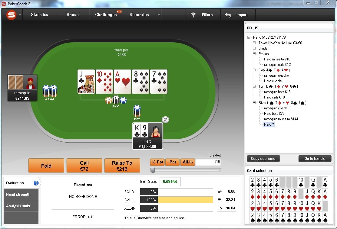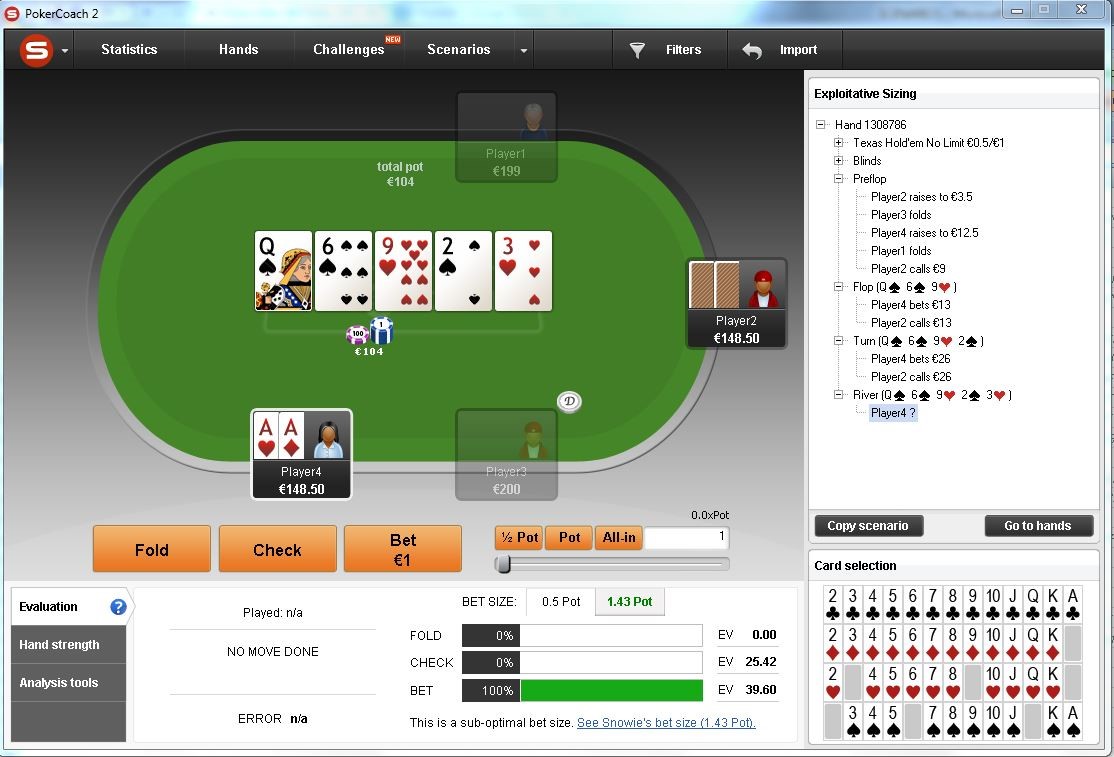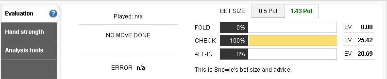 为了做到这点,PokerSnowie输入对手的范围,并假定他们是完美游戏的。我们都知道,这并非总是正确的,但PokerSnowie仍然是一种提醒我们所有可能犯错的场合的极好工具。