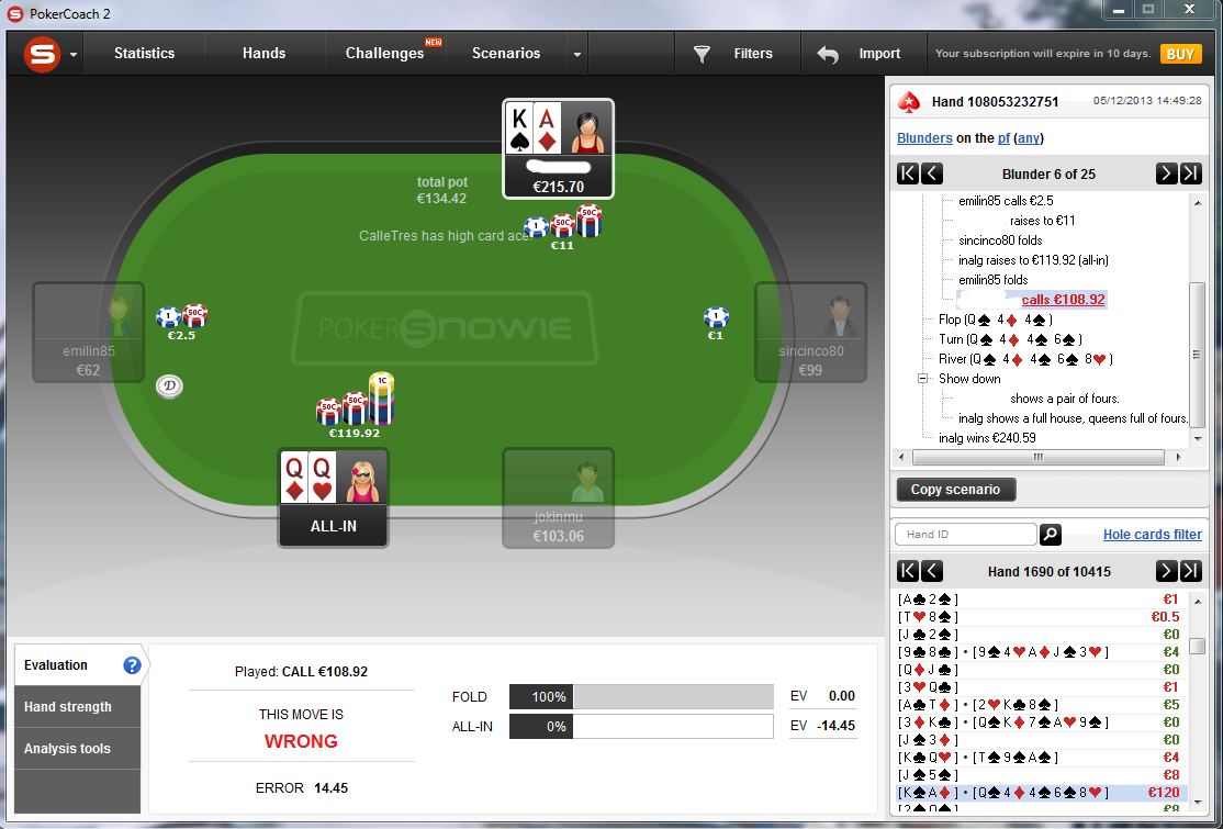 这是PokerCoach的主要功能。当分析一个session或一个数据时,PokerSnowie将综合评论我们所有打过的牌,并指出我们的错误。这意味着PokerSnowie着重研究我们采用的非最优玩法(因此放弃了一部分底池权益)的每一个决定。