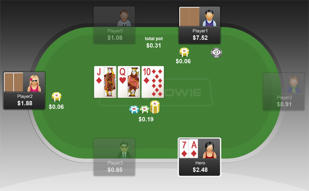 Hero在大盲位置用A♦ 7♦防守,然后在翻牌圈拿到了一个带卡顺听牌的坚果同花听牌。这时他遇到了一个下注和一个跟注。放弃一手高胜率的牌肯定很傻,但Hero这里应该跟注还是加注呢?