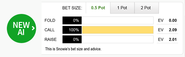 因此,因为这种公共牌结构,我同意新版PokerSnowie在这里只是跟注的建议。然而,要注意的是,两个决定非常接近,在EV上只有0.08BB的差异。