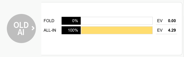 老版PokerSnowie给跟注+4.29BB的EV,但这是明显偏离事实的,因为对手必须用比最好30%起手牌更宽的范围全压,才会发生这种情况。