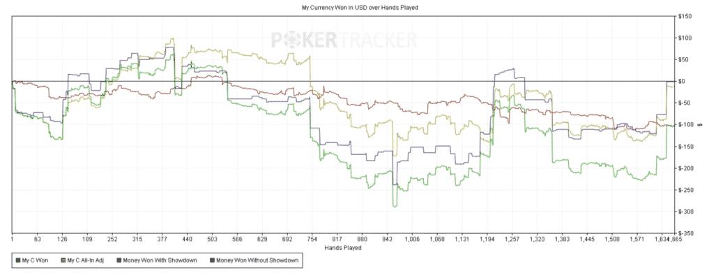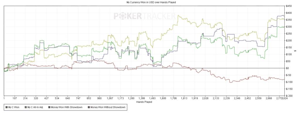 这些利润丰厚的调整已经被Ryan Fee测试过。Ryan Fee为了测试Upswing Poker最近开发的一个模块,在Americas扑克室打了1万手$0.25/0.5级别的德州扑克。这是他意识到玩家池满是跟注站之前的收益图: