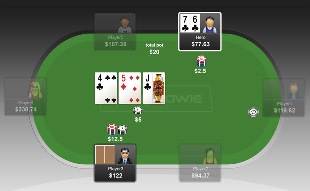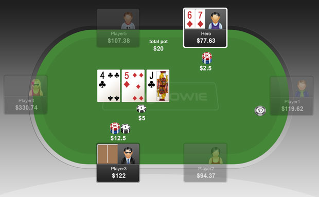 Hero有一个带后门同花听牌的顺子听牌,隐蔽性很好,当他完成听牌时,他应该能得到价值。跟注允许Hero在发出草花时去诈唬,假装完成了同花。