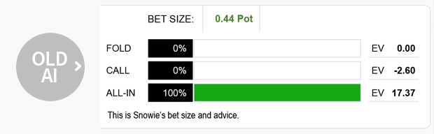 根据对这类场景的模拟情况,老版PokerSnowie的绩效不是太好。PokerSnowie对不同玩法的评估往往是不合逻辑的。例如,在上例中,老版PokerSnowie估计跟注在权益上将损失2.6BB,而全压则赚到17.37BB。而这是不可能的,因为两种玩法几乎总是导致同样的结果。跟注和全压的唯一差异是,如果大盲玩家全压,Hero仍然可以弃牌。我还没看到新版PokerSnowie出现任何这样的漏洞,新版PokerSnowie推荐的决定看起来好了很多。