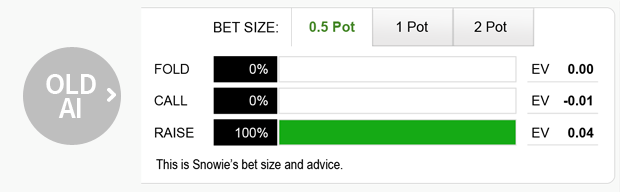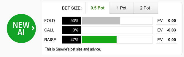 PokerSnowie刚刚发布时,我认为它证明我想错了。根据新版PokerSnowie的评估,我当时对了一半(也错了一半)。PokerSnowie仍然评估出这手牌强到足够在枪口位置率先加注,但并不总是如此。为了不使我们的率先加注范围太弱,我们应该采用混合策略来游戏这手牌,并且在53%的时候弃牌。