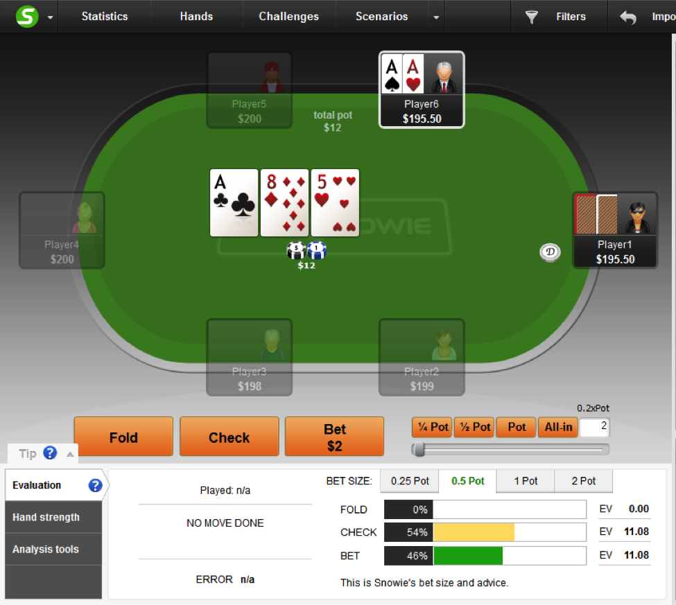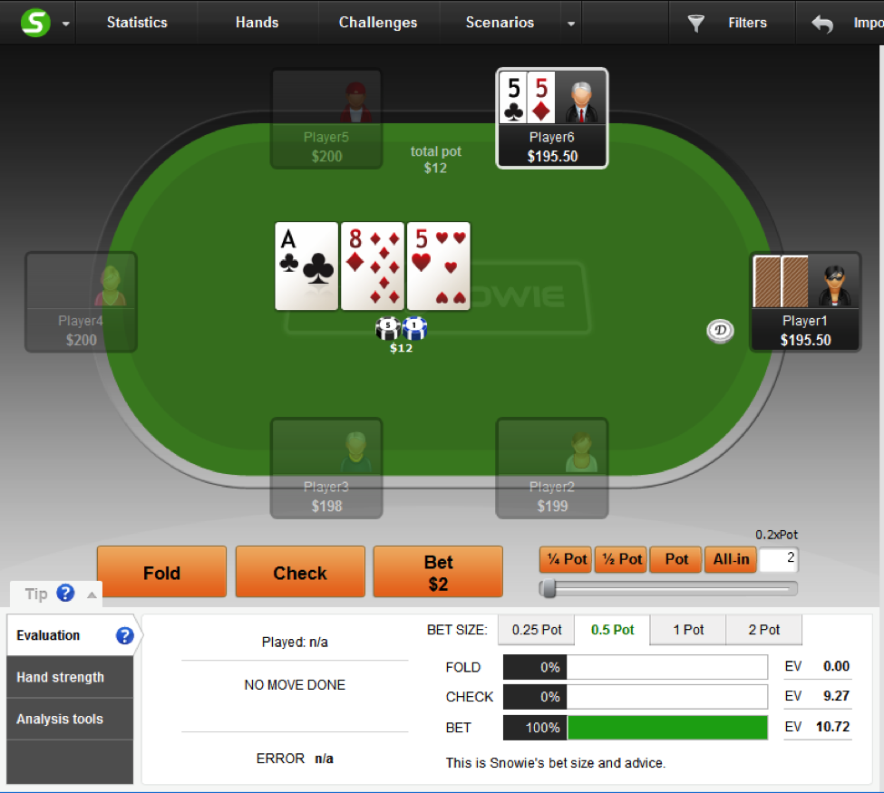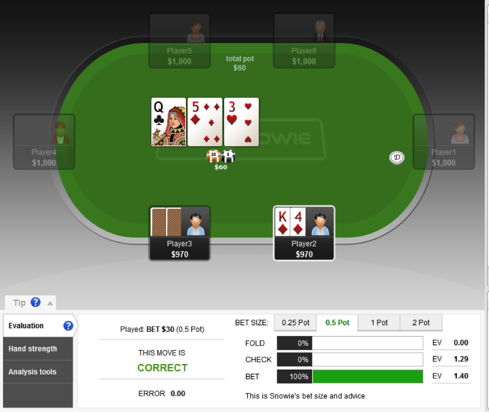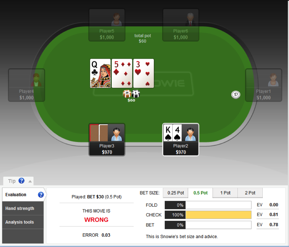 因此,用顶大暗三条做持续下注你赚到的EV会稍多一点,因为它明显是比最小暗三条更好的牌。但是,我们并不总是(100%)用它下注。事实上,PokerSnowie建议,只在不到一半的时候下注。如果顶大暗三条比最小暗三条赚到更多的EV,哪为什么只在不到一半的时候下注呢?