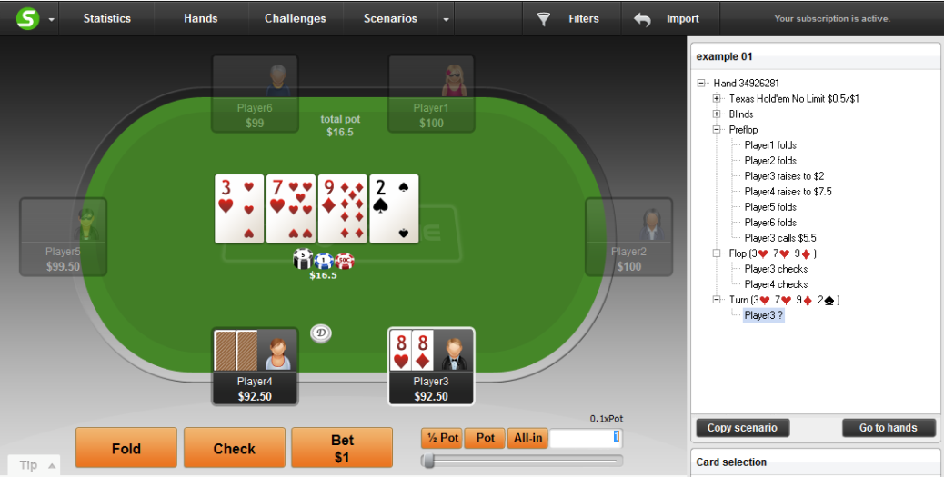 如图,你在不利位置拿着一手中等牌(对8)。很可能你拿到了最好的牌,但你的牌容易受到高牌的伤害。显然,这是一个你不希望下大注的场合。老版本和新版本的AI(PokerSnowie)都承认,对于半个底池、一倍底池和两倍底池的下注额,最好的策略是check。