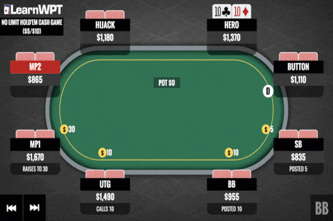 翻前我们有坚实的理由用这手牌加注。但鉴于枪口玩家首先跛入,和中间位置玩家偏小的加注尺度,以及相对较深的筹码量,这是一个为了暗三条价值把口袋对10当作投机牌游戏的好场合。