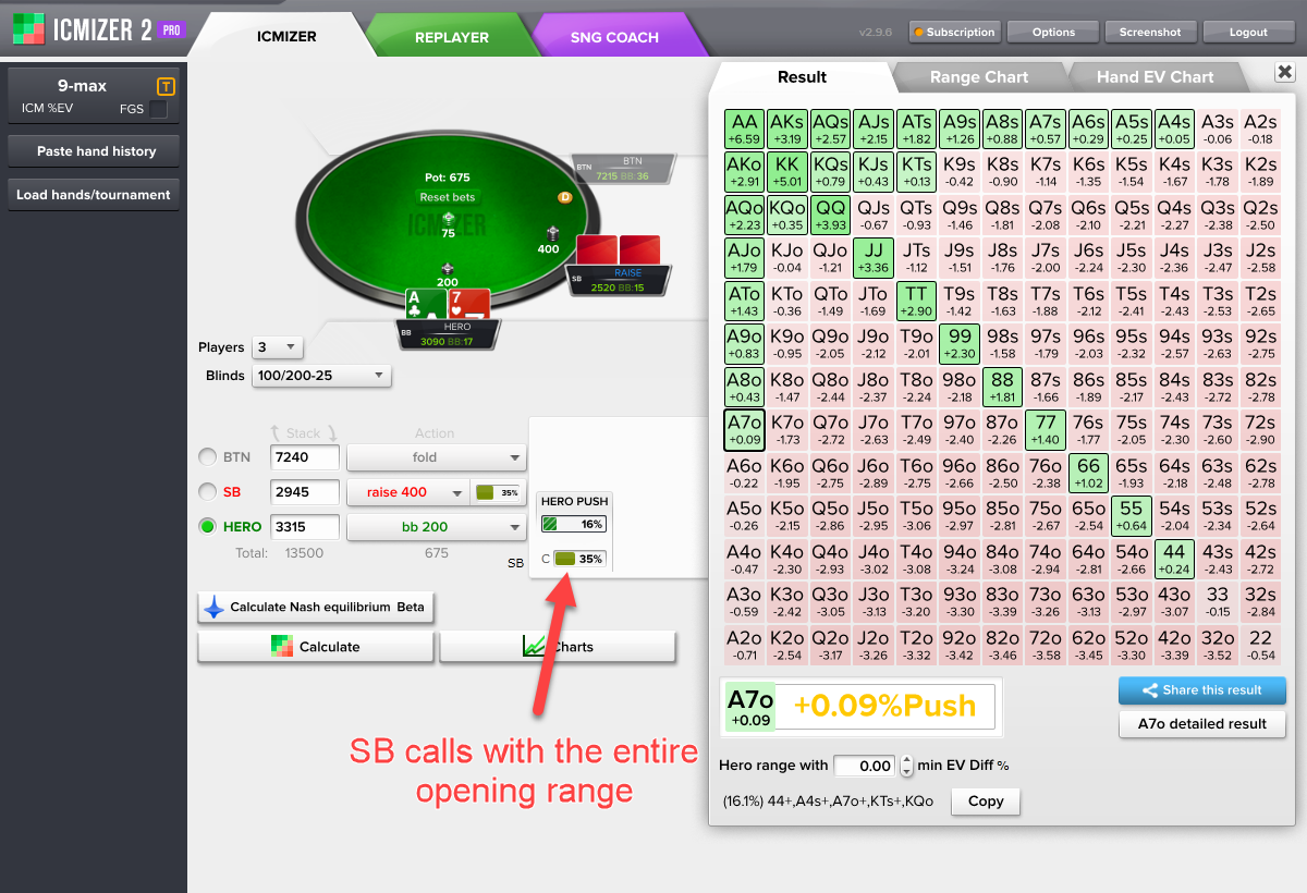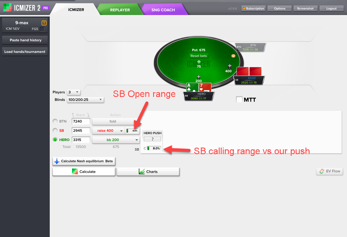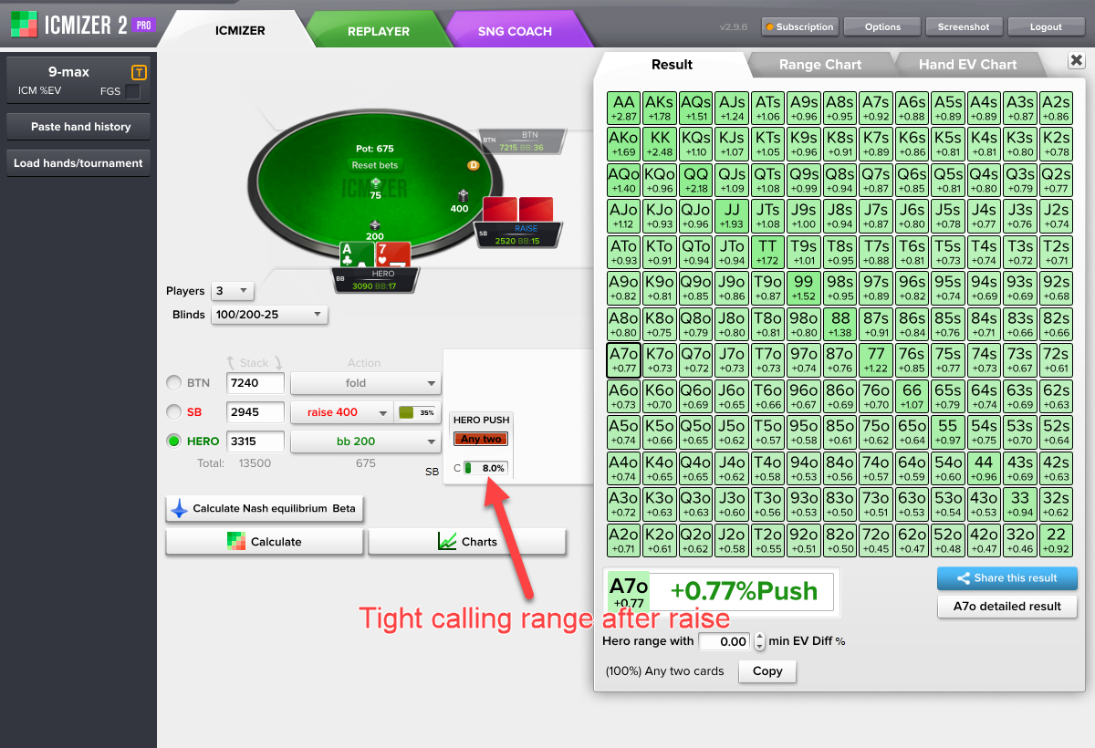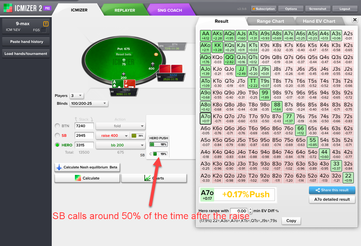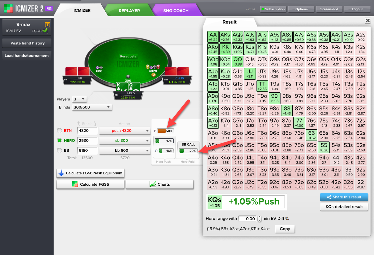 你从ICMIZER计算器得到的结果取决于你的输入。ICMIZER的使用是艺术与科学的结合。纳什均衡范围是科学的那部分,而艺术的部分是你对于对手的范围所做的手动调整。