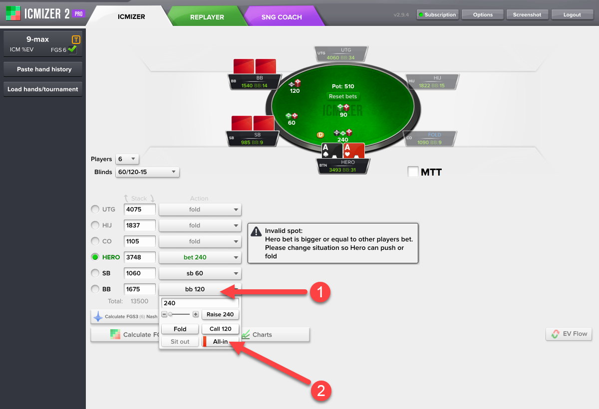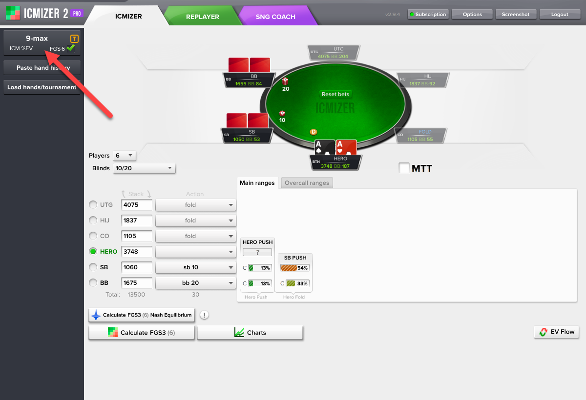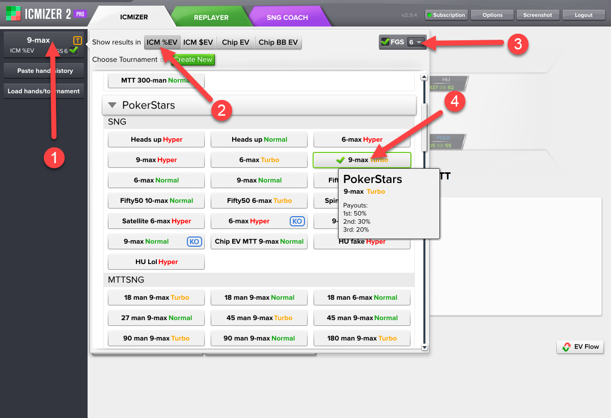 在弹出窗口选择ICMIZER %EV模式(②),然后勾选FGS(③),并选择深度值6。选择FGS是告诉ICMIZER使用FGS模式进行计算。FGS是扑克锦标赛的最高级模式,它对标准ICM模式进行了很大的改进。