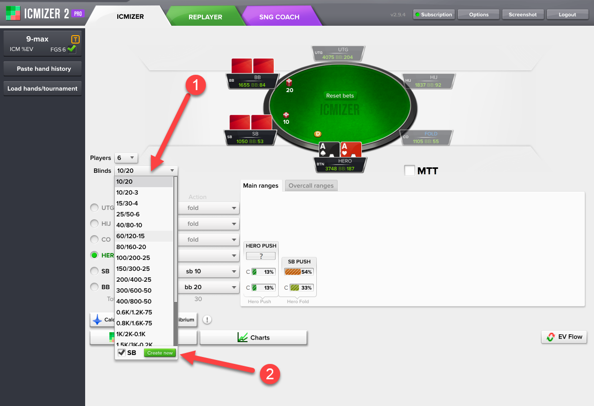 接下来,在盲注选择下拉框(①)把盲注级别设置为“60/125-15”。注意,如果你需要增加一个不在列表的盲注级别,你可以点击绿色的“Create new”按钮(②),然后增加了一个自定义盲注级别。