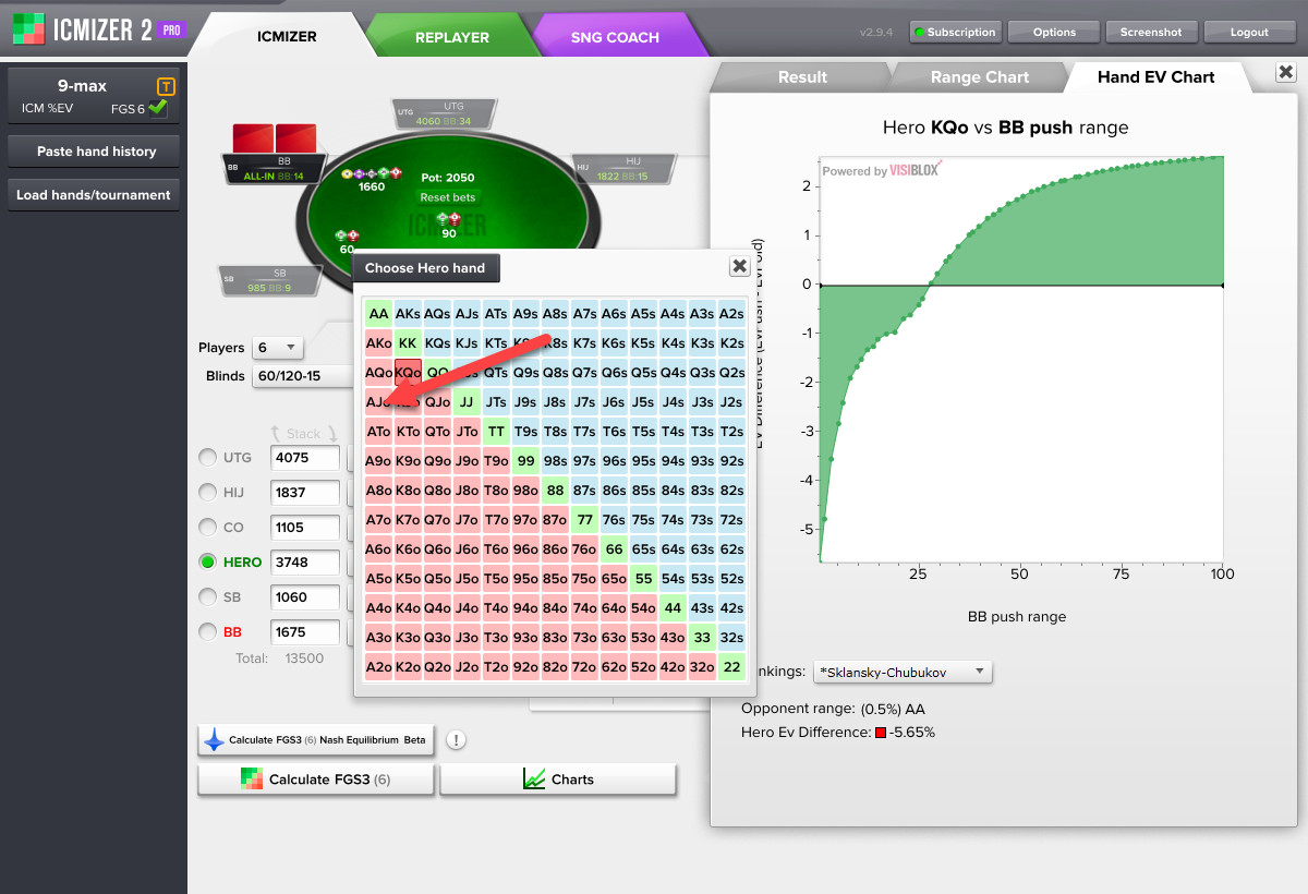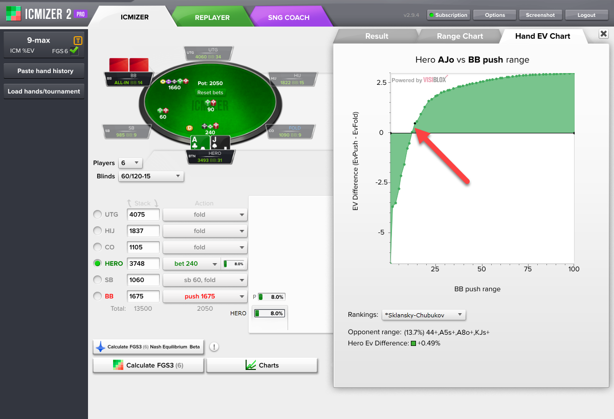“Charts”按钮可以帮助我们查看:为了使我们的跟注有利可图,大盲位置的牌手应该用多宽的范围全压。